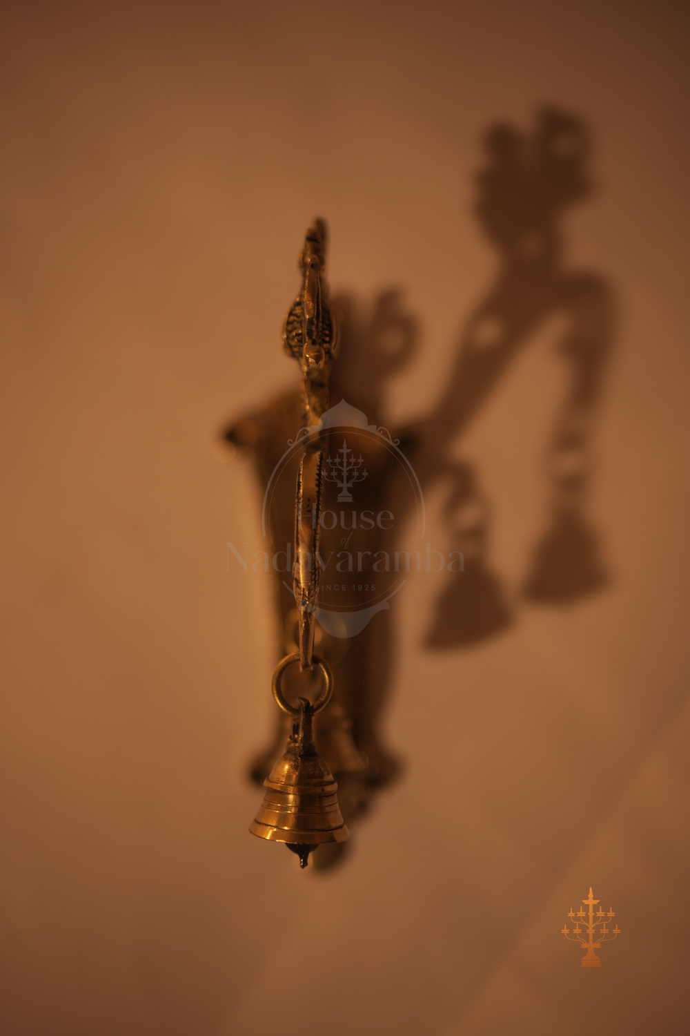 Crafted from solid brass, it offers durability and stability while maintaining a refined decorative appeal. The detailing on the surface reflects traditional craftsmanship, making it suitable for temple entrances, pooja rooms, verandahs, or even as an artistic accent in modern interiors.