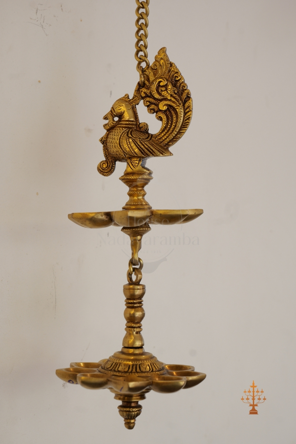 Across Tamil Nadu and Kerala, the hanging lamp represents the removal of darkness and the awakening of knowledge. The Annapakshi (mythical celestial bird) motif at the top symbolizes abundance and spiritual elevation.