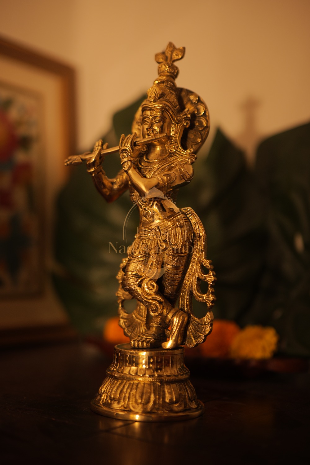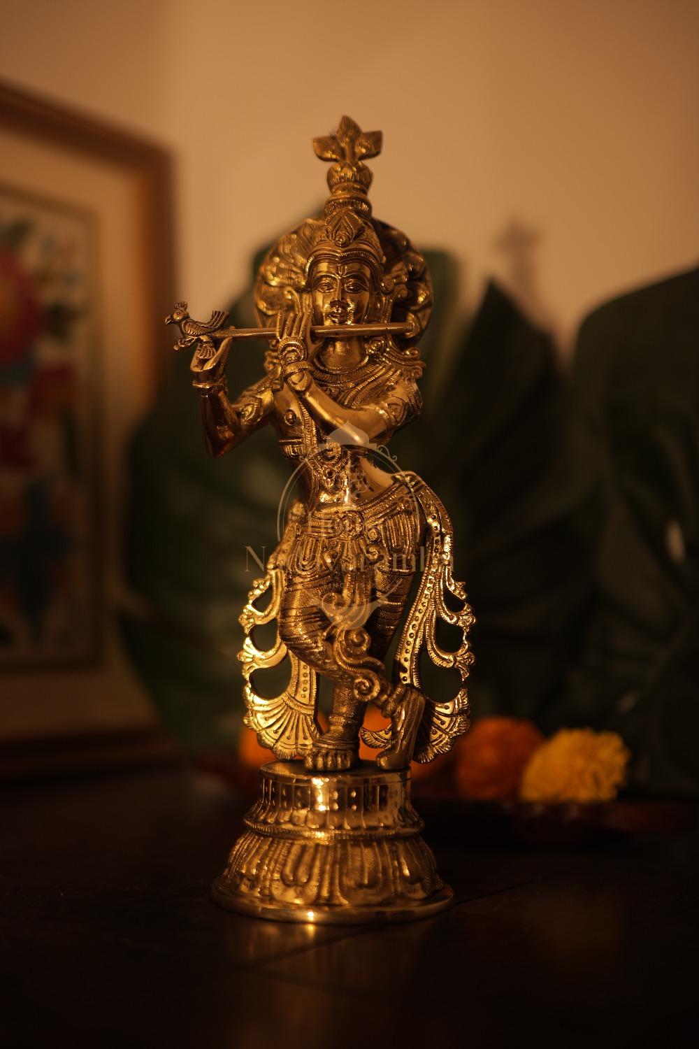 Glossy gold finish slender Krishna idol.