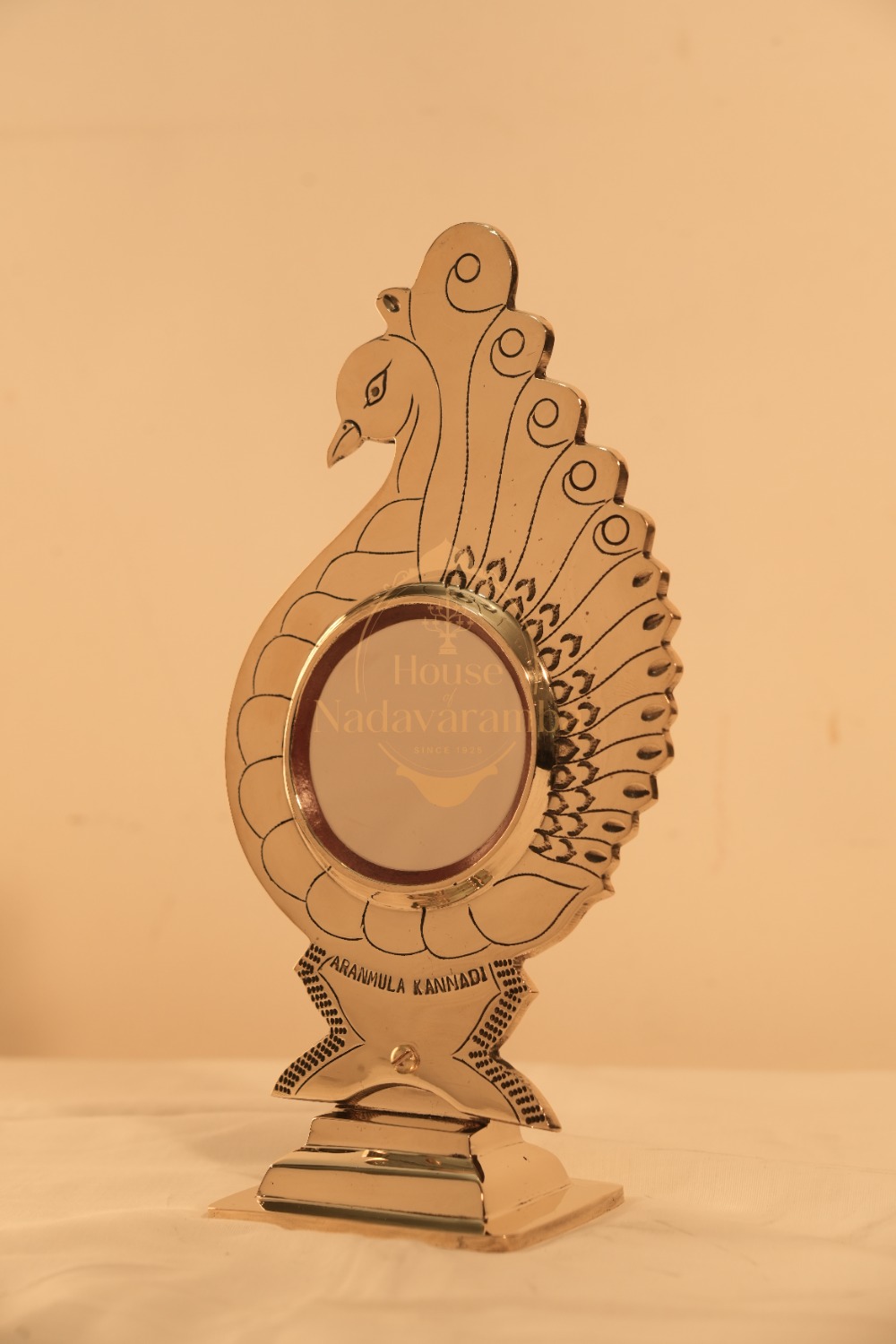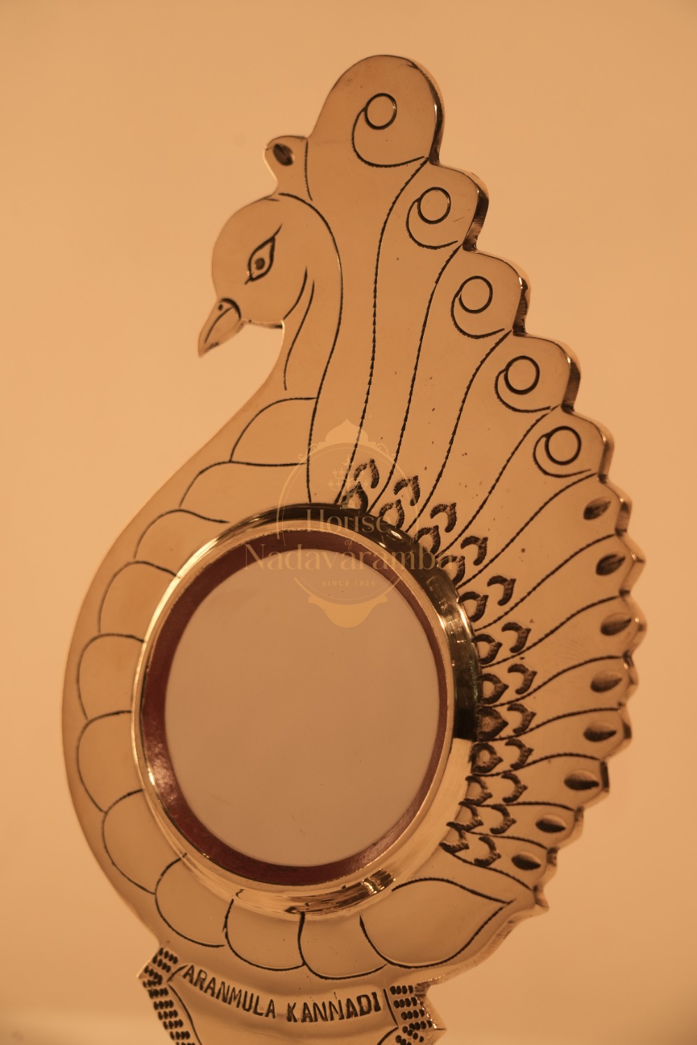 Compact yet elegant Peacock Peedam Aranmula Kannadi crafted with intricate detailing. The handcrafted metal mirror reflects Kerala’s timeless artistic traditions and spiritual symbolism.