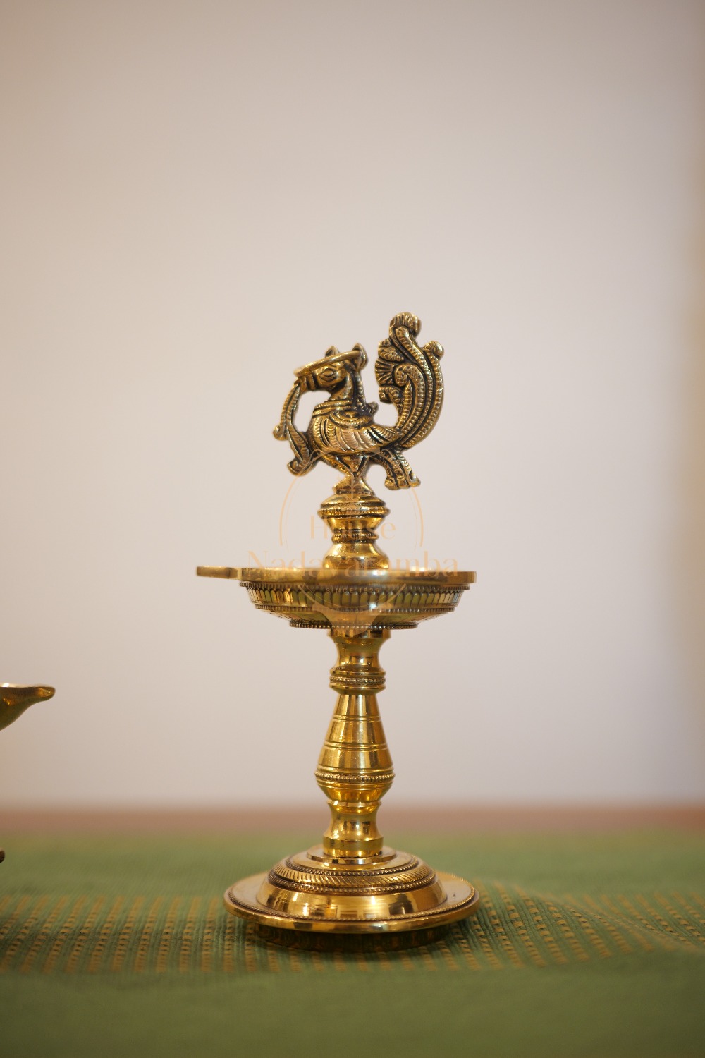 Standing 6 inches tall and weighing 850 grams, this deepam offers both stability and graceful presence while remaining compact enough for any pooja setup.